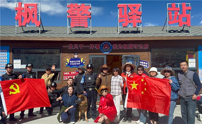 新疆克州讯(通讯:彭虎成)10月1日,白沙湖畔的“枫警驿站”前洋溢着欢声笑语。新疆克州加克拉克边境派出所的民警与八方游客手执鲜红党旗与五星红旗,在蓝天白云下共同定格下难忘的国庆瞬间。张张笑颜与迎风招展的“中国红”相映生辉,浓浓爱国情与深深警民鱼水情在镜头中温暖流淌。