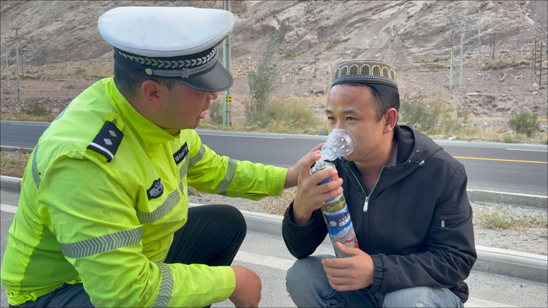 “我怎么也想不到你们车上还会有这些东西”马先生吸着氧气边呼吸边说道。10月1日16时,阿克陶县公安局奥依塔克交警中队巡逻民警发现一辆停在红山口的越野车,车内游客面色发紫、呼吸急促。民警迅速从后备箱取出氧气瓶为其供氧。