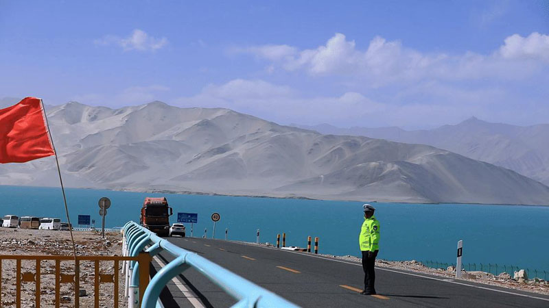 新疆讯(通讯:赵楷) 在海拔3600多米的帕米尔高原,314国道如银链缠绕于慕士塔格峰脚下,近年来白沙湖景区、喀湖景区、帕米尔高原景区等地成为热门旅游地,国庆期间车流量、人流量激增。为了确保道路安全畅通,阿克陶县公安局奥依塔克交警中队在各个关键路段和路口分布警力,指挥交通、疏导车流,确保车辆有序通行。