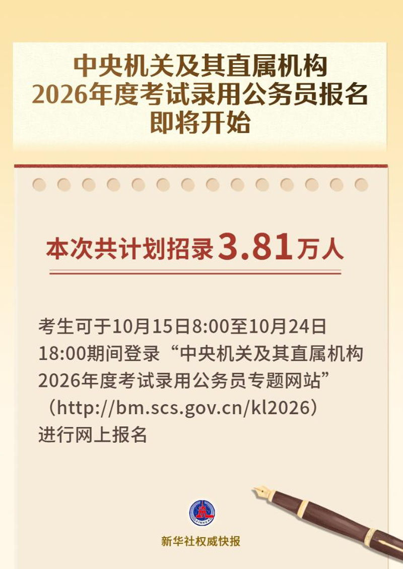 北京讯 记者14日从国家公务员局获悉,中央机关及其直属机构2026年度考试录用公务员报名即将开始,共计划招录3.81万人。考生可于10月15日8:00至10月24日18:00期间登录“中央机关及其直属机构2026年度考试录用公务员专题网站”(http://bm.scs.gov.cn/kl2026)进行网上报名,公共科目笔试将于11月30日在全国各直辖市、省会城市、自治区首府和部分城市同时举行。