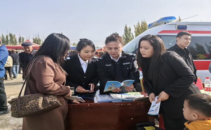 活动现场,司法所工作人员与普法志愿者化身“法治摊主”,在巴扎核心区域精心搭建沉浸式宣传阵地:悬挂“弘扬法治精神·共建和谐社会”主题横幅营造浓厚氛围,陈列图文并茂的普法展板直观解读法律知识,设立“法律诊所”式咨询台提供精准服务,全方位构建起群众看得见、易参与的法治宣传场景。考虑到巴扎商户集中、人员流动大的特点,宣传团队创新采用“固定点位+流动宣讲”模式,不仅在宣传点提供集中服务,更主动深入集市各个角落,在馕坑旁、瓜摊边、商铺内与群众拉家常、话法治,让普法宣传“动”起来、“活”起来。