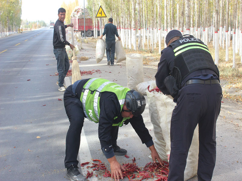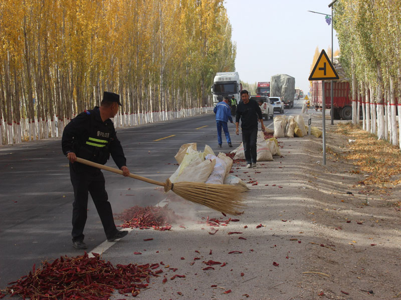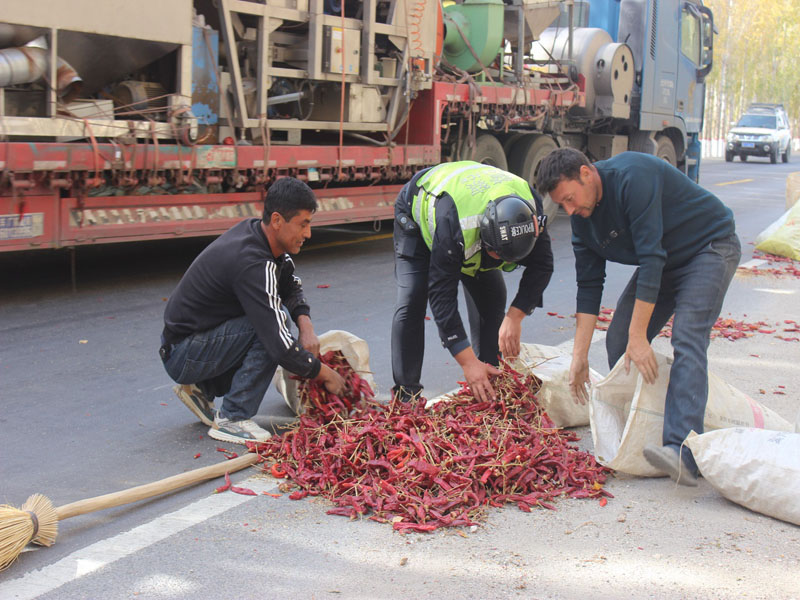 新疆讯(通讯:折树艳、吾丽亚提·阿不来提)“真是太感谢你们了!这车辣椒是全家的指望,要是没有你们帮忙,我一个人不知道要弄到什么时候,这些辣椒要是坏了,损失可就大了!”10月27日,在新疆和硕县曲惠镇曲惠西街加油站前路段,货车司机艾师傅紧紧攥着民警的手,指节因用力而微微发白,声音里满是激动与感激,眼角还泛着未褪去的红。此时,原本散落一地的鲜红辣椒已全部重新装车,此前拥堵的路面也恢复了畅通。