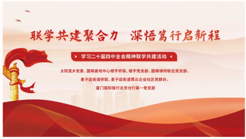 11月7日,“联学共建聚合力 深悟笃行启新程”学习党的二十届四中全会精神联学共建活动在“霄云荟”党群服务中心举行。此次活动由太阳宫乡党委、麦子店街道、国樽楼宇侨联,联合国樽律所联合党支部、国樽赢地中心楼宇党支部、厦门国际银行等7家单位共同主办,覆盖社区、银行、街道、律所等多个领域的党群干部和基层党员。