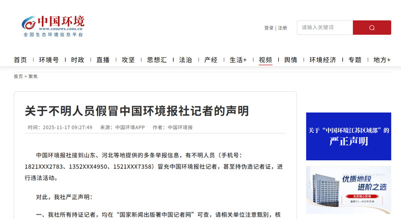 中国环境报社接到山东、河北等地提供的多条举报信息,有不明人员(手机号:1821XXX2783、1352XXX4950、1521XXX7358)冒充中国环境报社记者,甚至持伪造记者证,进行违法活动。