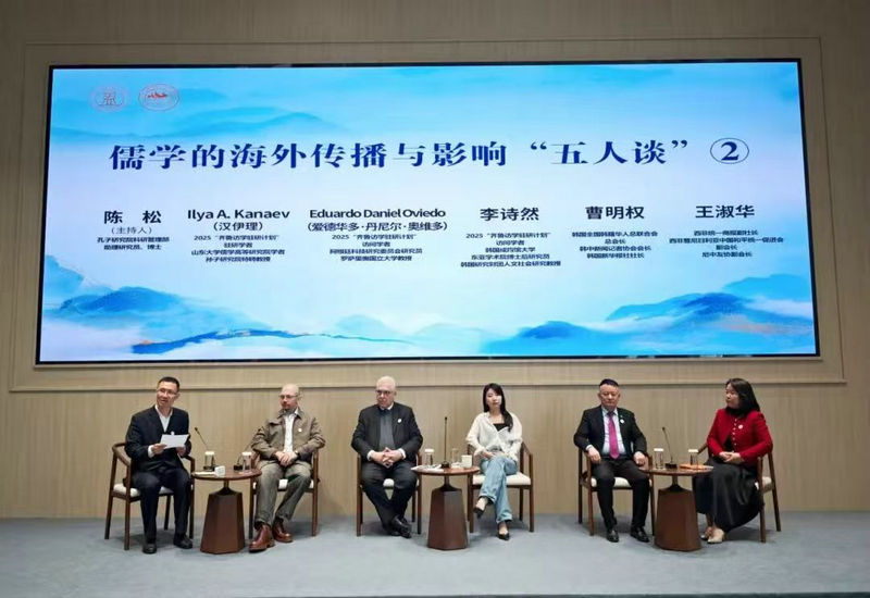与会专家学者与海外华文媒体代表,围绕儒学的历史发展、当代价值、研究现状、国际传播及媒体融合等议题进行了访谈交流。研讨内容广泛而深入,不仅追本溯源,重探“仁者爱人”“中庸之道”“和合共生”等经典命题的当代价值,更以比较哲学与全球伦理的视野,阐发儒学智慧在应对现代性挑战、推动多元文明共存中的独特贡献。既有儒学对当代青年人格塑造的价值与影响探讨,也有对孟子“心性之学”与西方德性伦理的对话交锋;既包含对儒家经典文本的现代阐释,也探索其在全球语境下的传播路径。整场研讨兼具理论深度与实践视野,思想火花不断迸发,充分展现了儒学在跨文化语境中的丰富内涵与当代活力。互动环节中,现场听众向专家学者、海外华文媒体代表进行了提问,进一步促进了不同学术背景与文化视角的思想交融,生动诠释了“和而不同”“兼容并蓄”的儒学智慧,现场学术氛围浓厚热烈。