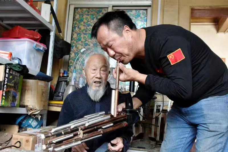 卢俊军向年近百岁的老父亲卢景有请教制笙的技艺