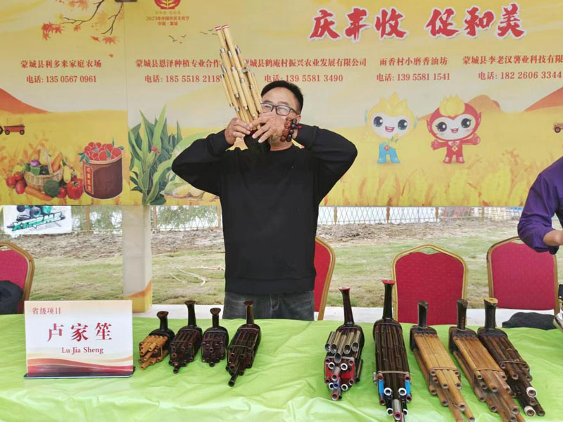 卢家笙的第四代传人卢俊军在蒙城县庄子祠向国家级50多家新闻媒体介绍非物质文化遗产卢家笙的制作技艺