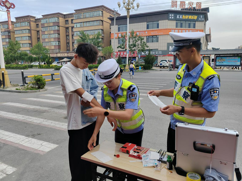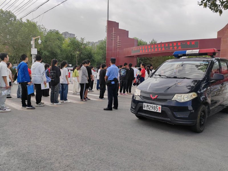 高考前,焉耆公安在考点外张贴横幅,专门安排车牌尾号为“985”的警车在考场外执勤,为考生加鼓劲,提前布置便民服务点,为考生准备考试用笔、水、应急药物等,以备不时之需,安排警用摩托车、专人专岗,以帮助忘带证件的考生返家拿取,保证服务效能,以高昂的服务激情为考生注入活力、动力。同样是在早晨第一场考试前,考生韩杰因为胳膊上的伤口血痂脱落出血,急匆匆来到焉耆县一中考点便民服务点,焉耆县公安局交警大队执勤民警立即用提前准备好的急求物品对韩杰的伤口进行了消毒和包扎处理,叮嘱他注意卫生避免碰撞,并为他加油鼓劲。韩杰向民警表示感谢后便走向考场。