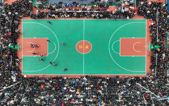 这是2023年3月27日拍摄的贵州省首届“美丽乡村”篮球联赛总决赛比赛现场(无人机照片)。 欧东衢 摄