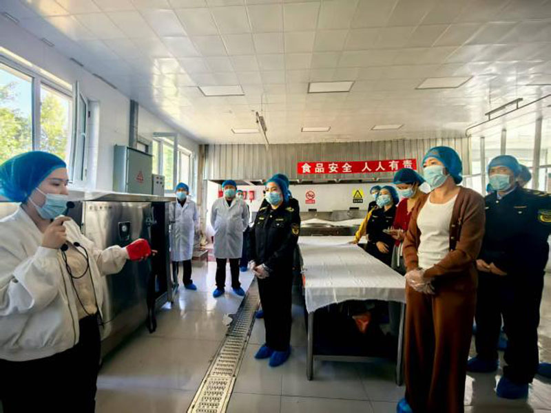 下午的沉浸式督导教学转战昭苏县第三中学食堂。专家对照《餐饮服务食品安全操作规范》,现场拆解食堂功能分区规划逻辑与流程衔接要点,直指烹饪区通风不足、洗肉池排水设计不合理等问题并给出整改方案。针对冷藏冷冻设备、清洗消毒设施、油烟净化系统等关键设备,逐一演示运行检查、日常维护及故障应急处置流程,强调温度记录、使用登记等规范要求。此外,重点规范刀具砧板色标管理、餐食留样等关键环节操作,切实强化从业人员实操规范性。