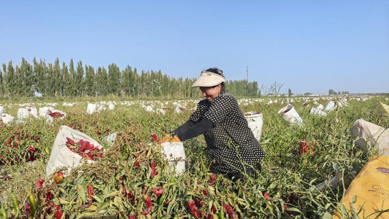 新疆和硕讯(通讯:谭雪梅)金秋九月,沃野流金。9月22日,漫步于二十四团广袤的田园之间,一幅色彩斑斓的秋收画卷徐徐展开——辣椒田里红浪翻涌,劳作声此起彼伏;不远处的大粒无核葡萄园内果香馥郁,工人们正于遮阳棚下专注地进行采收作业。田间地头跃动着一个个勤劳的身影,空气中交织着果实的甘甜与泥土的芬芳,共同谱写着新时代乡村振兴的动人旋律。