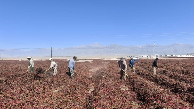 极目望去,数百亩晒场上宛如铺开巨大的赤色锦缎,晶莹剔透的辣椒铺陈其上,在秋阳映照下折射出炫目的光彩。工人们挥舞木耙不停翻搅,确保每颗辣椒都能均匀接受光照,蒸腾的水汽裹挟着辛辣香气直冲云霄,构成极具冲击力的视觉盛宴。
