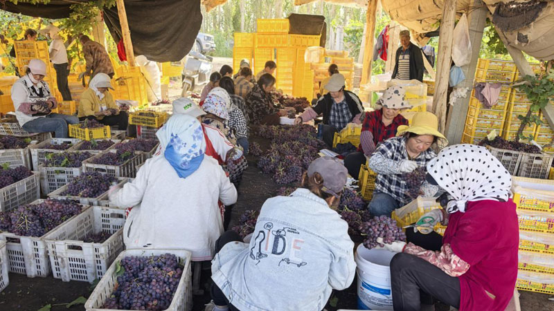与辣椒田的热烈氛围相映成趣的是葡萄园内的井然有序。正值大粒无核葡萄的最佳采收期,紫玛瑙般的果实缀满藤架,随手摘取一颗放入口中,清甜的汁液瞬间充盈味蕾。经验丰富的技术员现场指导工人严格遵循“三轻”原则——轻摘、轻放、轻装,最大限度保障果实完整度。分拣线上,工人们如同进行精密操作般细致筛选,将品相优良的葡萄轻柔装入透气保鲜箱。包装完成的精品葡萄整装待发,即将踏上前往全国各地的旅程,为消费者带去甜蜜滋味。