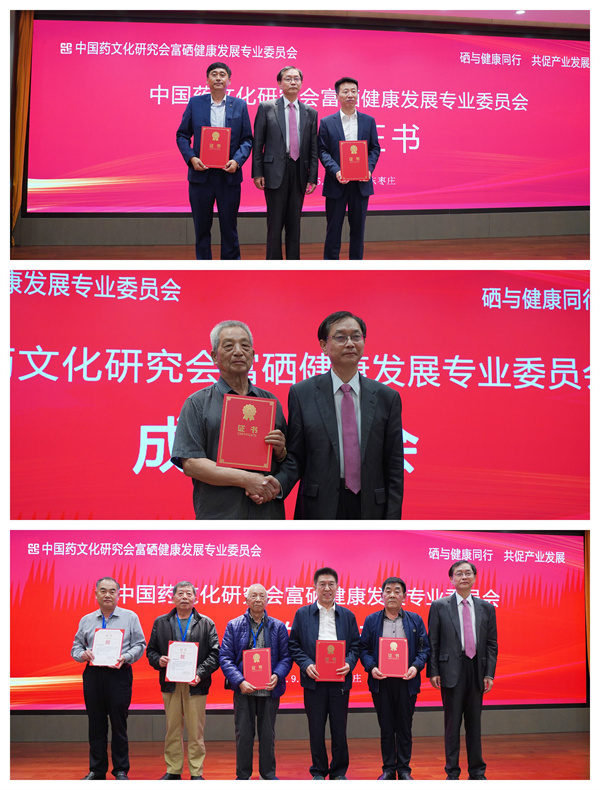 中国药文化研究会禹同生会长为富硒健康专业委员会名誉会长、会长、秘书长、顾问专家颁发证书。