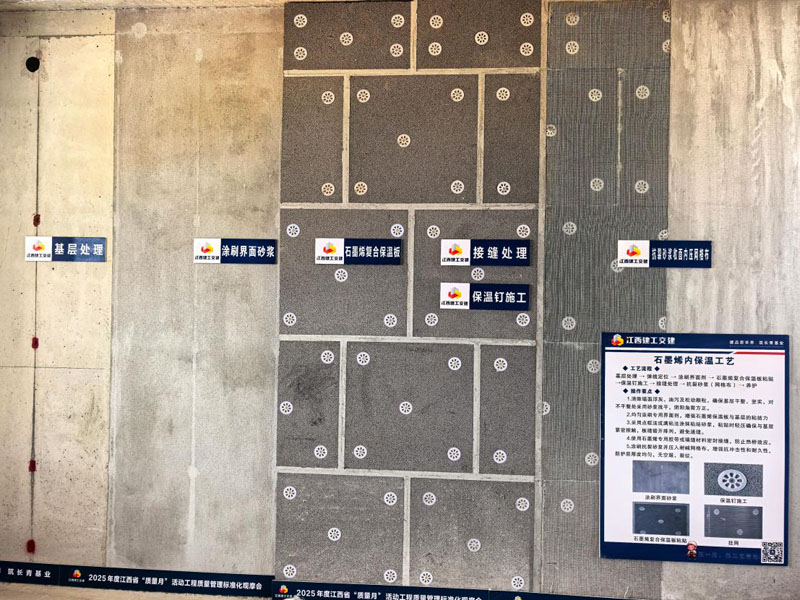 项目的质量特色亮点通过丰富的实体样板得到了直观呈现。在实体质量方面,创新应用了后浇带PVC管模混凝土独立支撑体系,并针对常见质量通病,系统展示了外墙螺杆洞防渗漏、烟道防窜味、门窗过梁及边柱一次成型等关键工艺。特别是装配式叠合板接缝“两防一提”施工工艺,有效防止了接缝处的渗漏与裂缝,显著提升了成型质量。观摩现场设置的室内分户验收样板、主体结构实体样板,将反坎、砌体、抹灰、防水、预制墙体安装等工艺节点及成品保护标准完全透明化。框架结构、楼梯、屋面工程等室外样板,配以“轴线、标高上墙”的清晰标识,为行业提供了可学习、可复用的工艺标准。