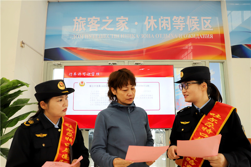坚守岗位、确保高效通关。双节期间,执法人员坚守岗位,提前制定通关车辆高峰应对预案,实时与海关、边检沟通信息,实现国门一线与口岸通关区密切配合、联动执法,保障每一辆车高效通关。仅10月4日当天10:00-:24:00,就为761辆车办理了出入境手续。一名回国过中秋的司机激动地说:“正是您们的坚守,才让我们的生活更加安心”。